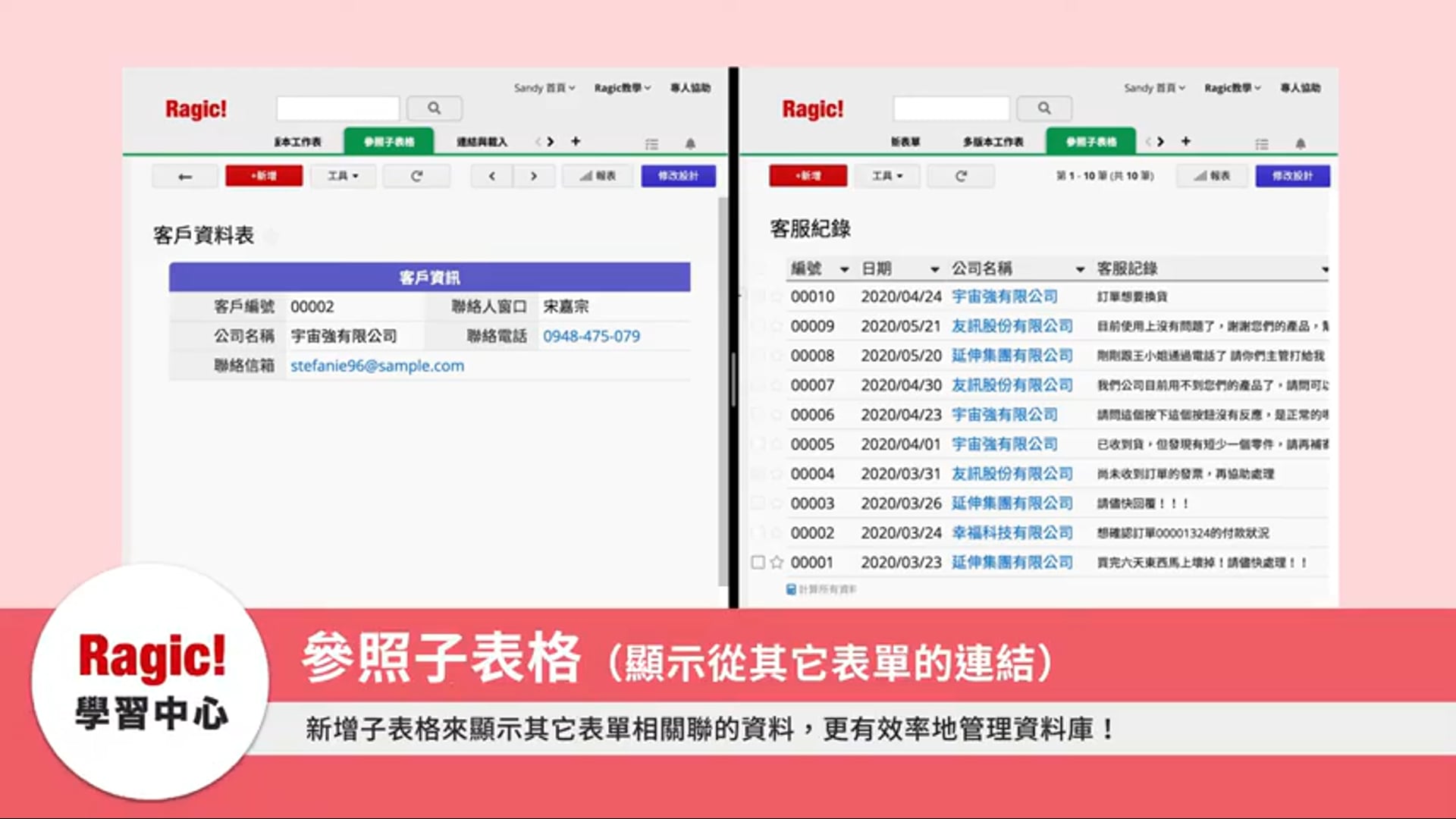 而在 Ragic,你可以用非常簡單的方法,就做到這種自動顯示關聯性的功能,把特定一筆資料的相關資料,變成 Ragic 的一個「子表格」顯示在底下。這種子表格就叫做「參照子表格」(顯示出相關的參照資料),功用就是「顯示從其他表單的連結」。