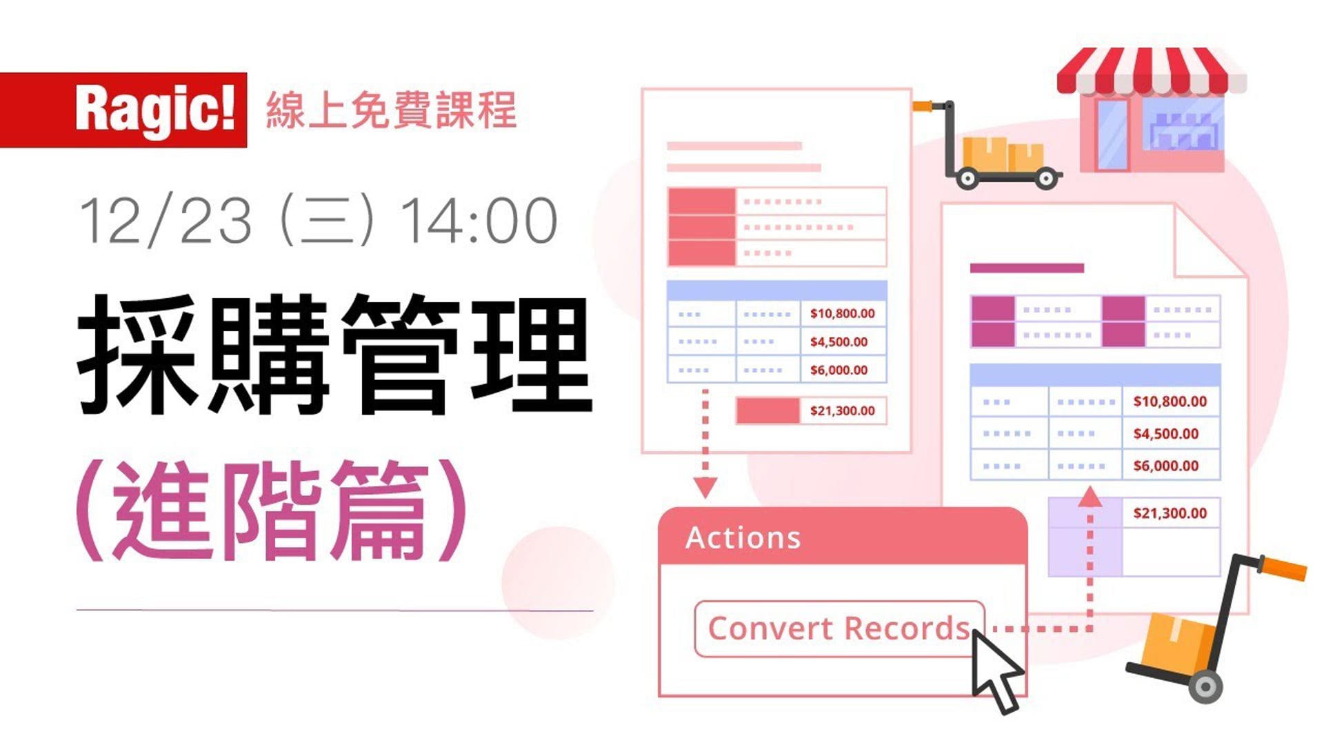 本次課程以採購管理為範例,示範怎麼在建立請購與採購單等資訊後,設計一個「拋轉」的動作按鈕來執行自動化流程,設計好之後,將能一鍵將請購單資料轉成採購單,讓採購管理更容易。