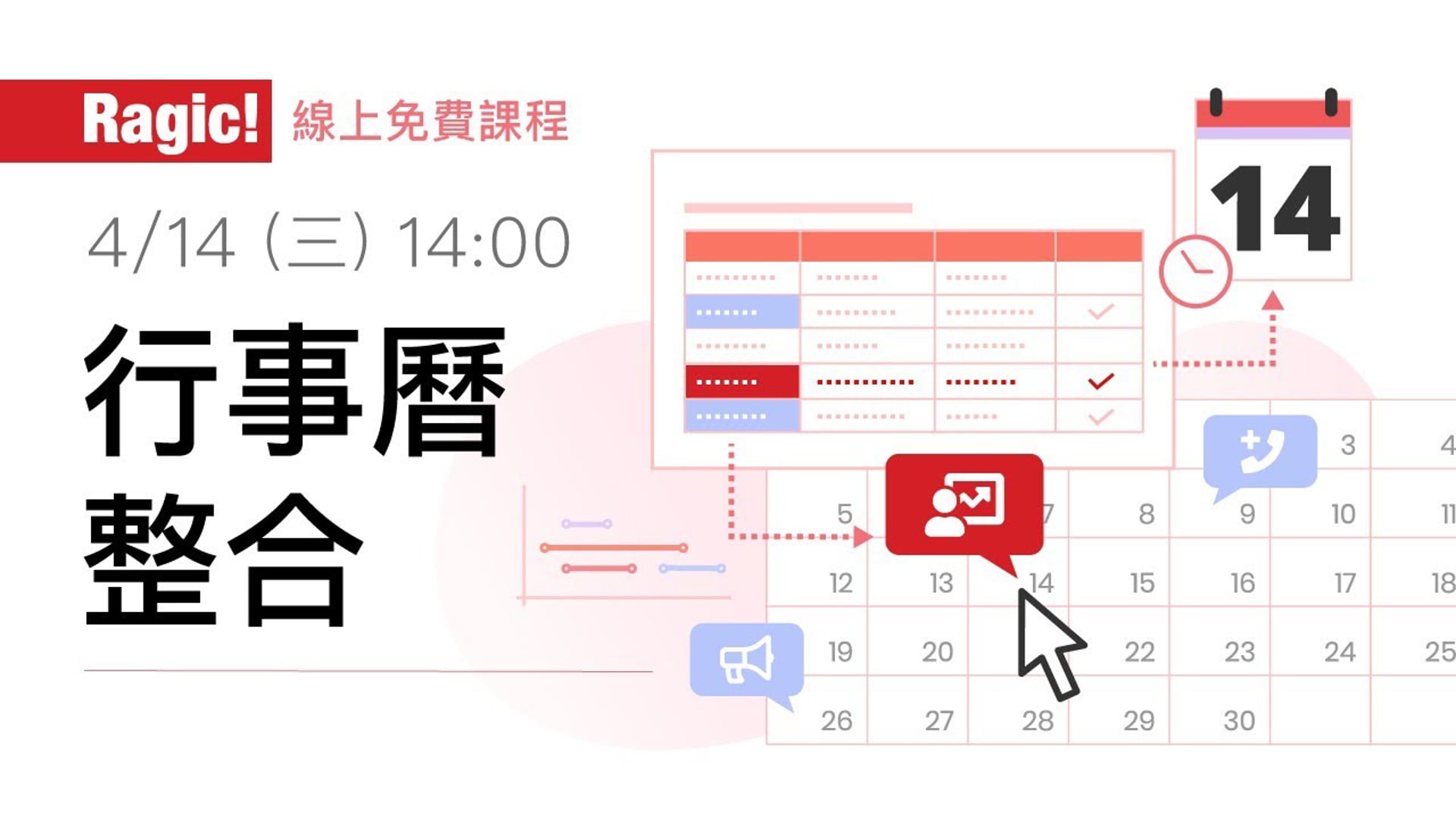本次課程就將以這三個情境為例,示範利用 Ragic 表單整合行事曆功能的各種方法。課程中將先示範建立簡單的 Ragic 表單、建立日期欄位,接著示範將這些表單資料上的「日程」資訊同步在行事曆上的方法。