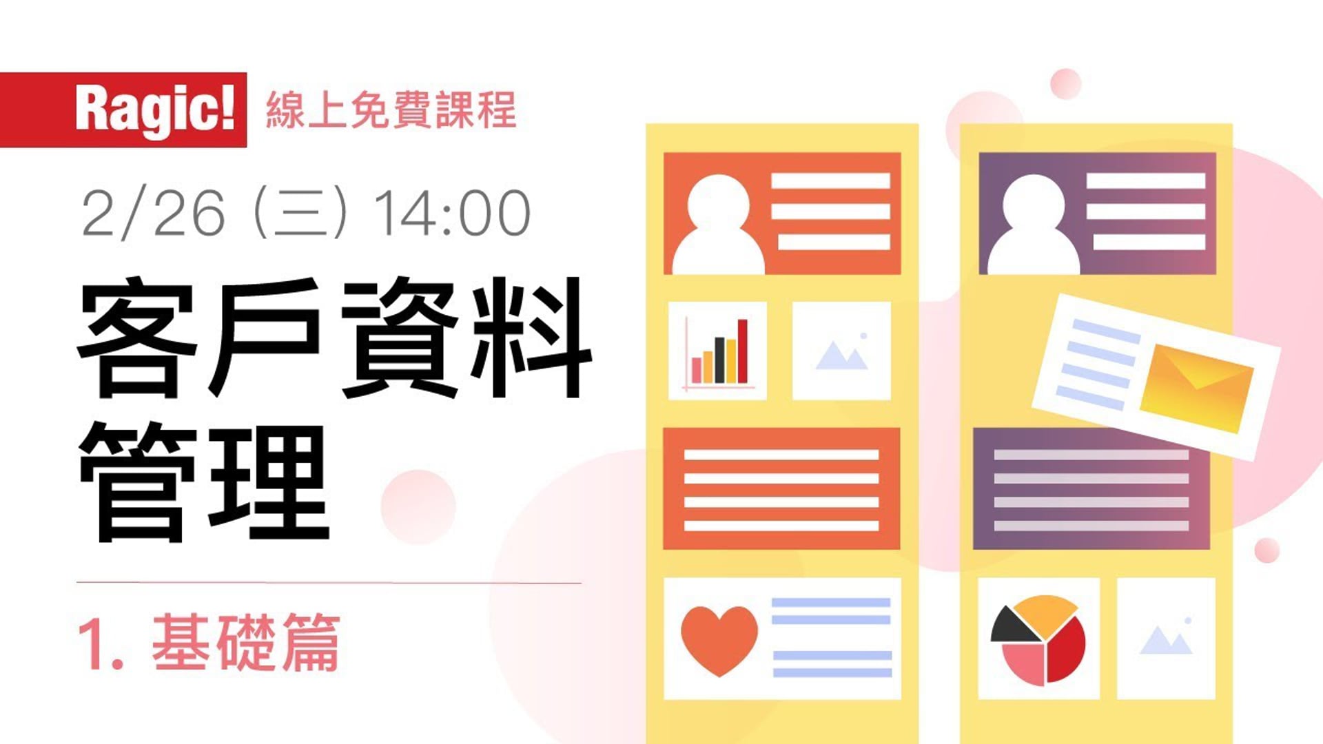 本次課程以業務上常用的「客戶資料管理」為範例,講解怎麼輕鬆建立潛在客戶、客戶、聯絡人資料,並與客戶追蹤紀錄連結起來,讓客戶資料管理更輕鬆、業務拓展更容易。