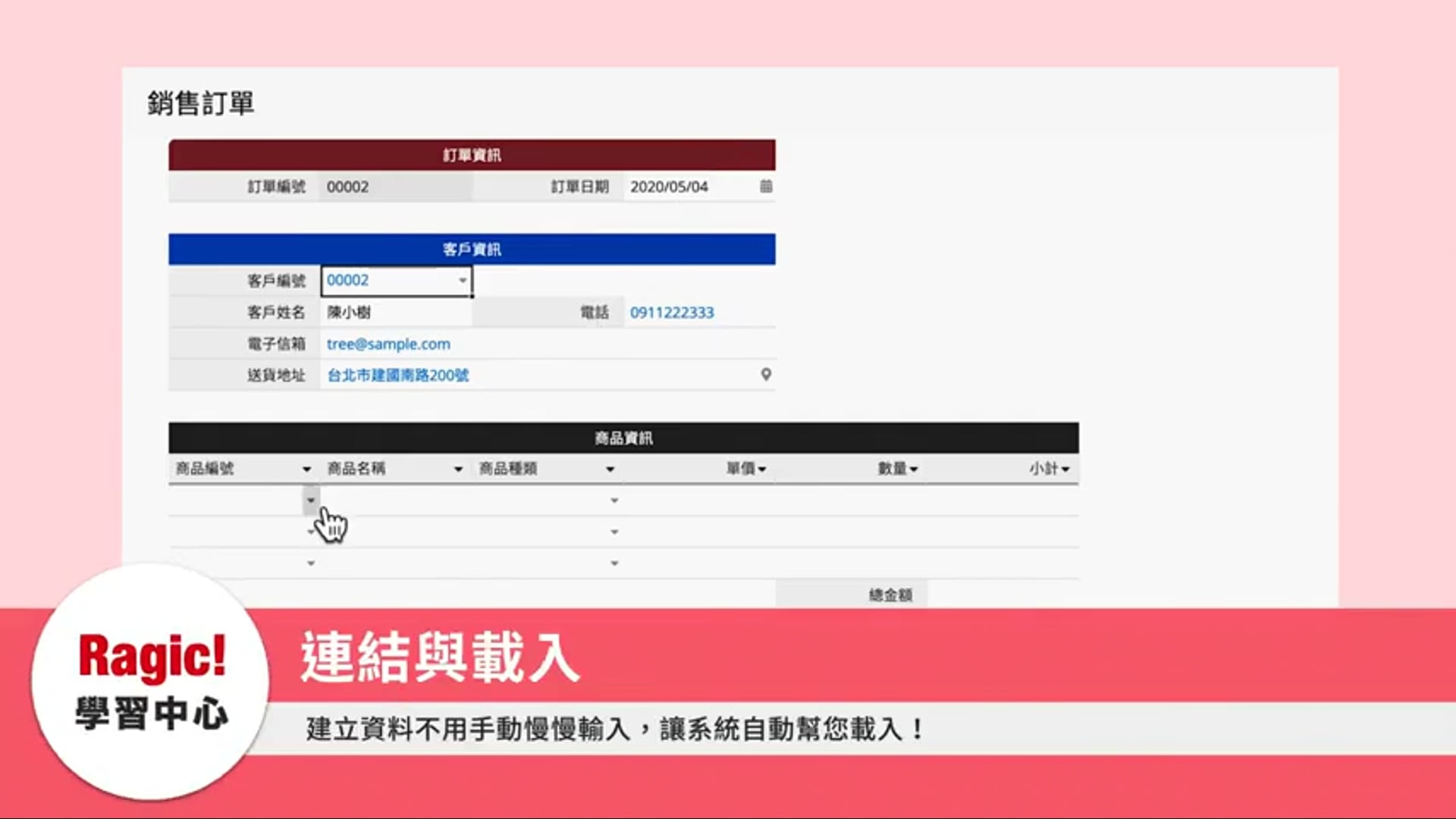 在這支影片,我們就要在 5 分鐘之內,說明「連結與載入」的意義,以及示範怎麼一步一步在「銷售訂單」上,建立與「客戶」資料、「商品」資料的「連結與載入」關係。