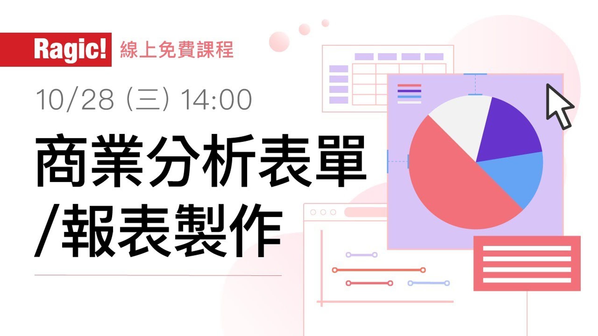 本次課程會以常見的SWOT分析,競爭者分析以及使用者研究為範例,講解怎麼建立相關表單以及如何利用Ragic的樞紐分析表,分群報表等報表來產生視覺上比較清楚的比較表。